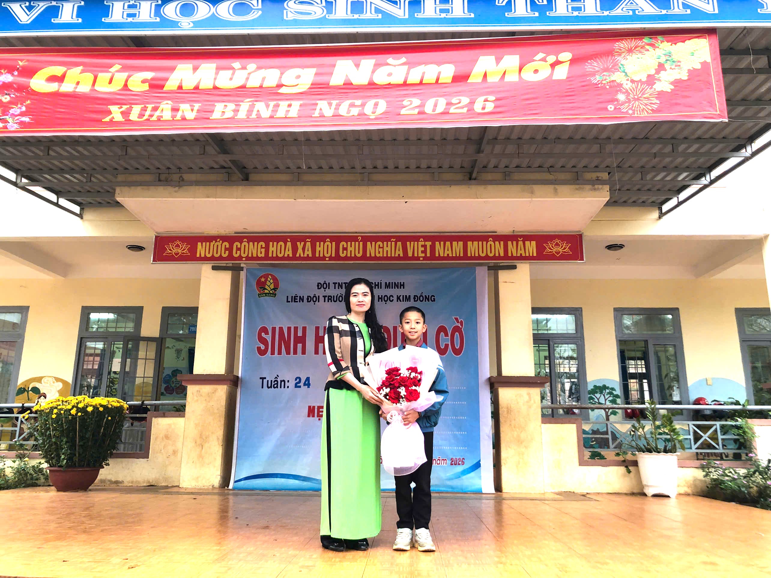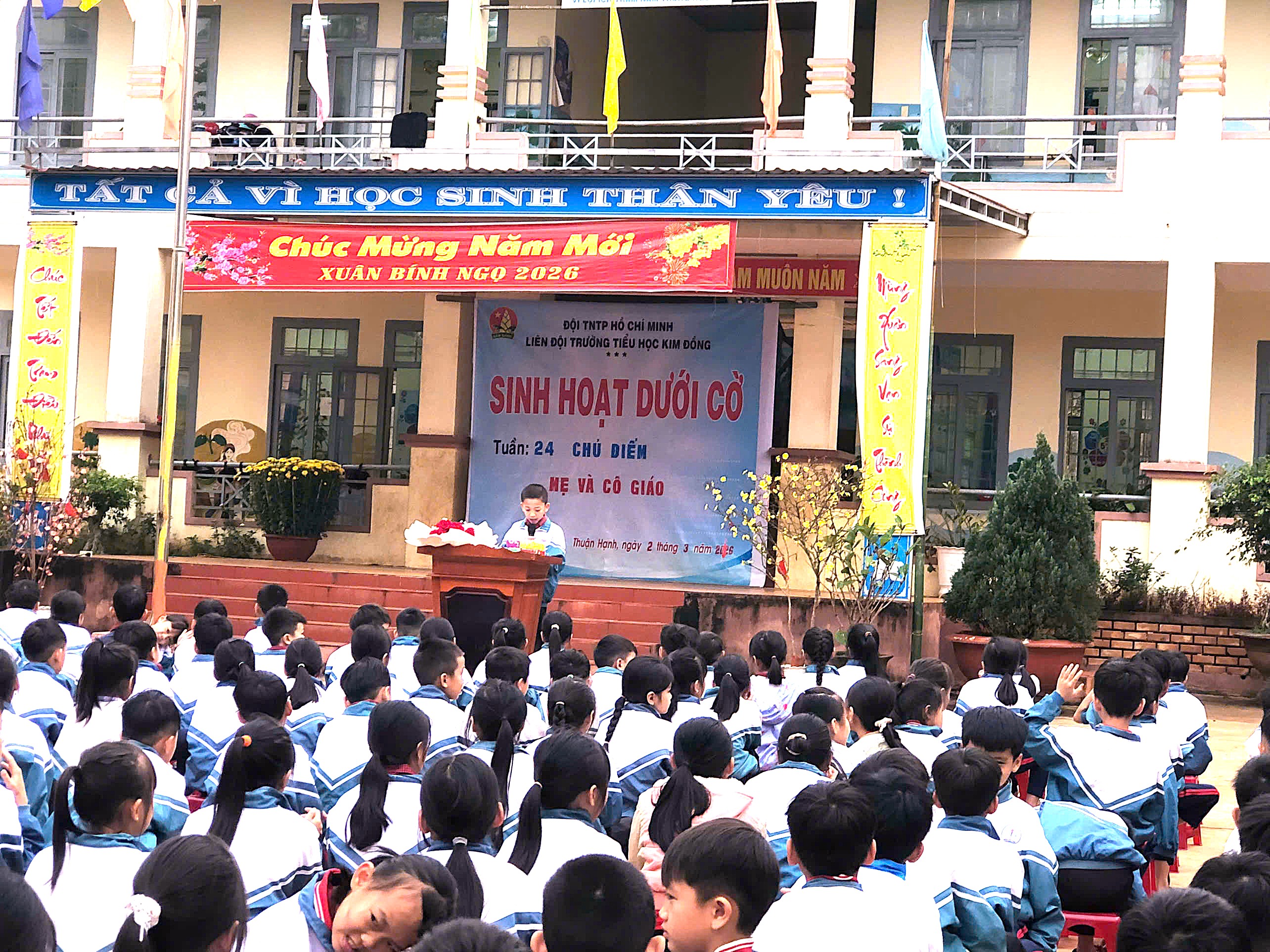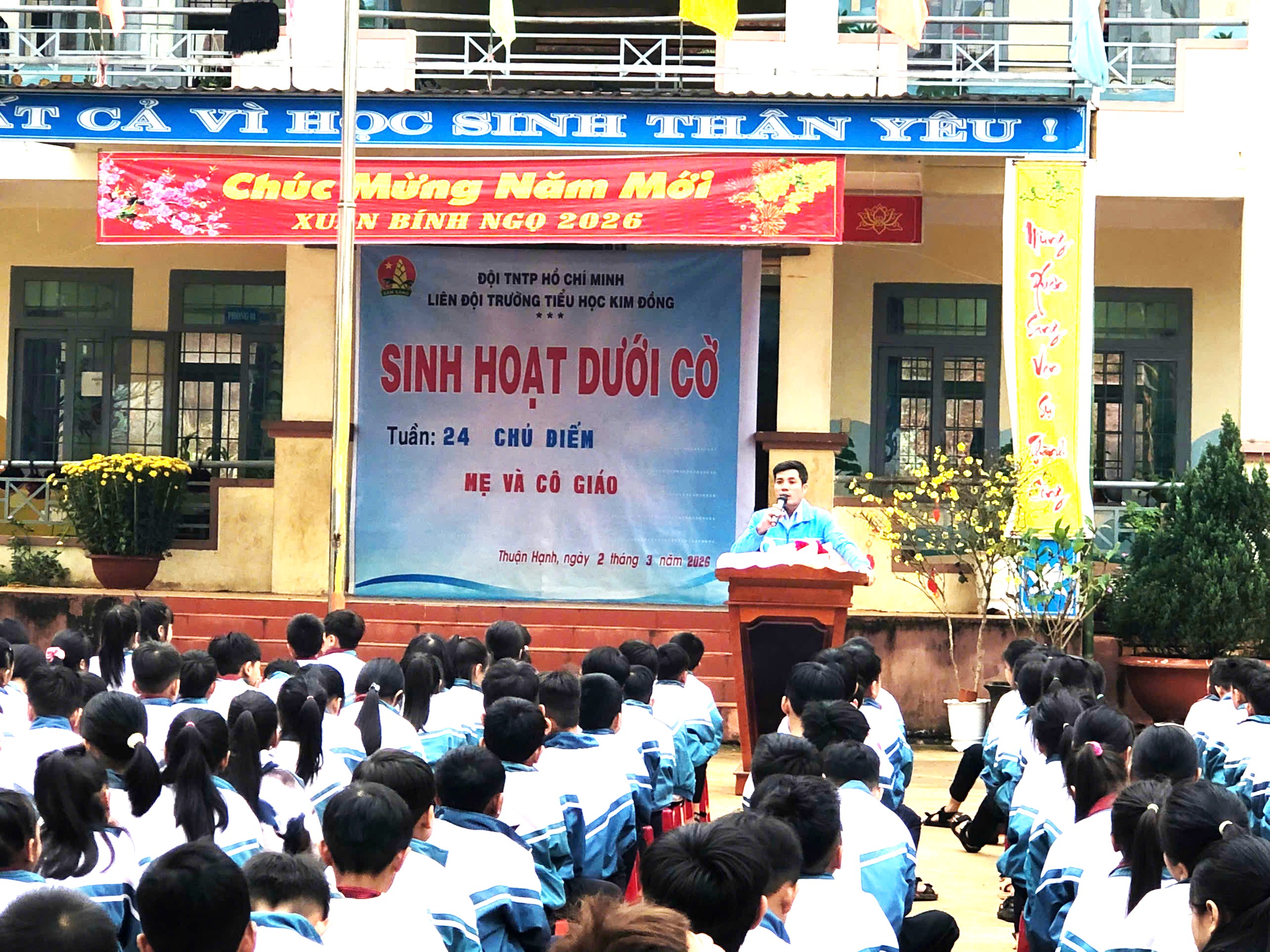 Sáng thứ Hai, ngày 02/3/2026, trong tiết Sinh hoạt dưới cờ Tuần 24 với chủ điểm “Mẹ và Cô giáo” 💐, Liên Đội Trường Tiểu học Kim Đồng tổ chức tuyên truyền, giáo